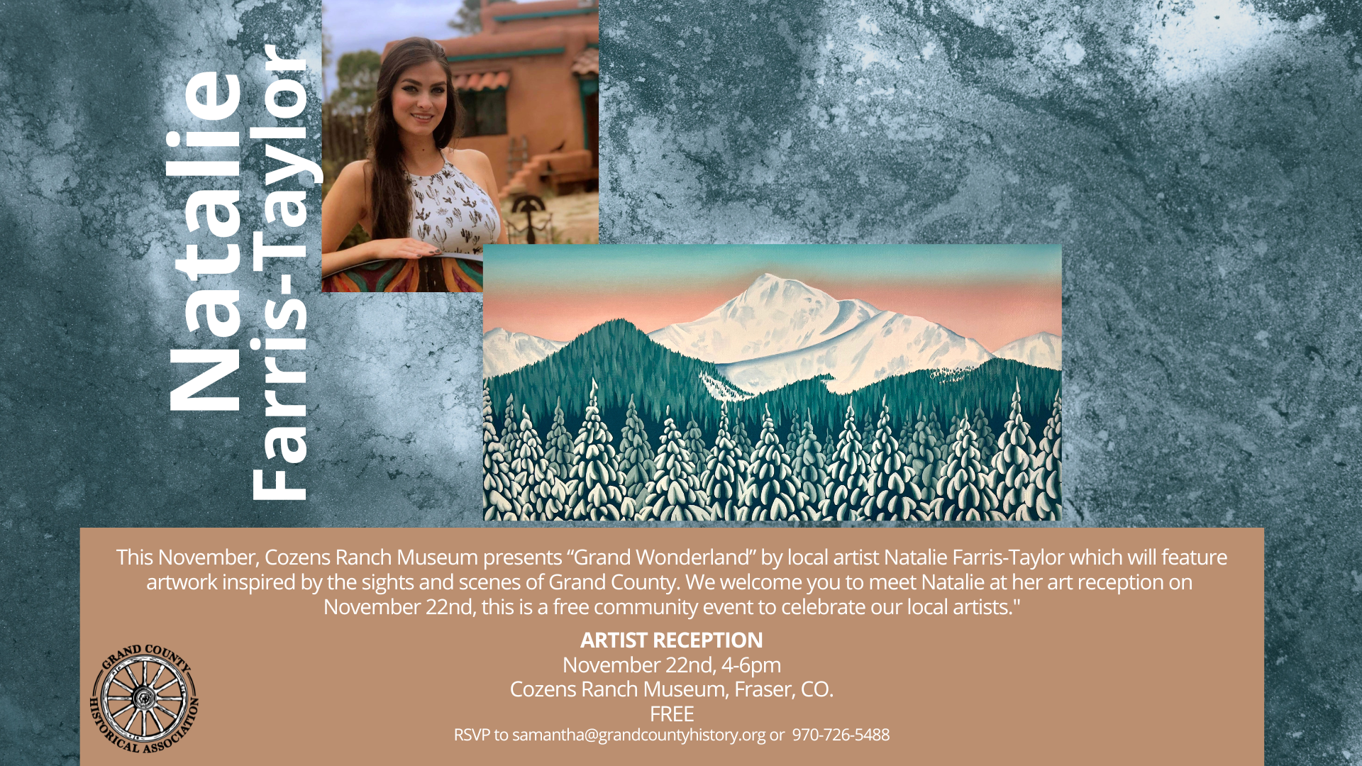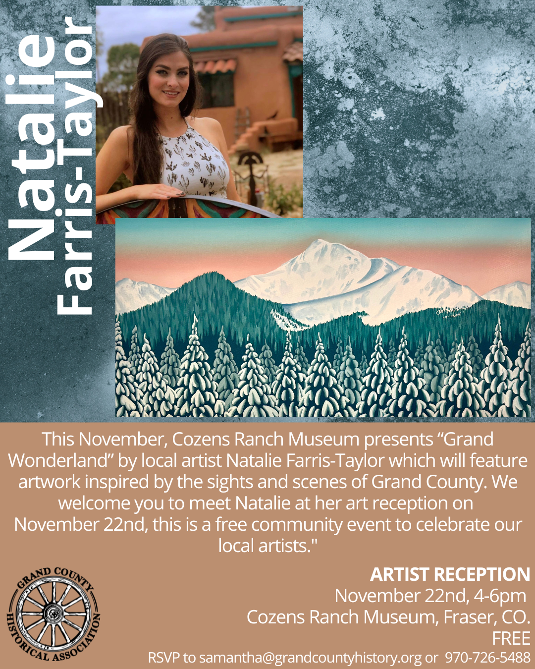 This November, Cozens Ranch Museum presents “Grand Wonderland” by local artist Natalie Farris-Taylor which will feature artwork inspired by the sights and scenes of Grand County. We welcome you to meet Natalie at her art reception on November 22nd, this is a free community event to celebrate our local artists.